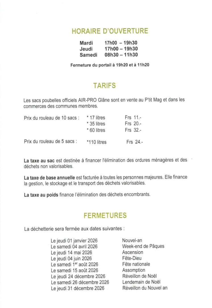 Le Conseil communal remercie les usagers de la déchetterie de bien vouloir respecter le travail des employés qui répondent aux exigences des autorités communales et des entreprises de recyclage.